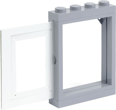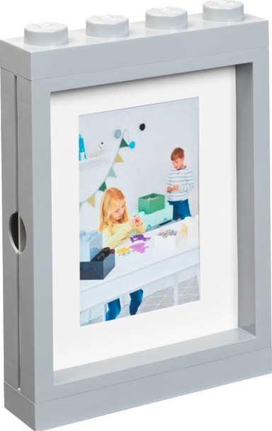 LEGO bilderamme er presentert i en boks som er designet for å minne om en stor LEGO-kloss, i hovedsak i lys grå farge med hvite knotter på toppen.Les mer om produktet