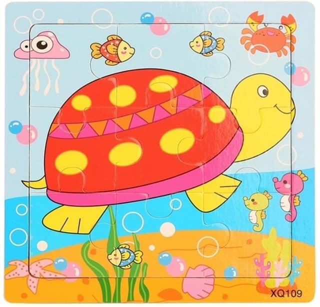 Rampesl med 9-biter for de mindre barna. Fargerikt puslespill med motiver som strekker seg over hele rammen.