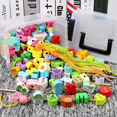 Med dette store treperlesettet kan barnet lære og ha det gøy samtidig! Settet består av en oppbevaringsboks, armbåndssnorer og 55 treperler i ulike farger og former, inkludert: dyr, frukt, grønnsaker, trafikanter, vær, tall og bokstaver.Sikker designLes mer om produktet