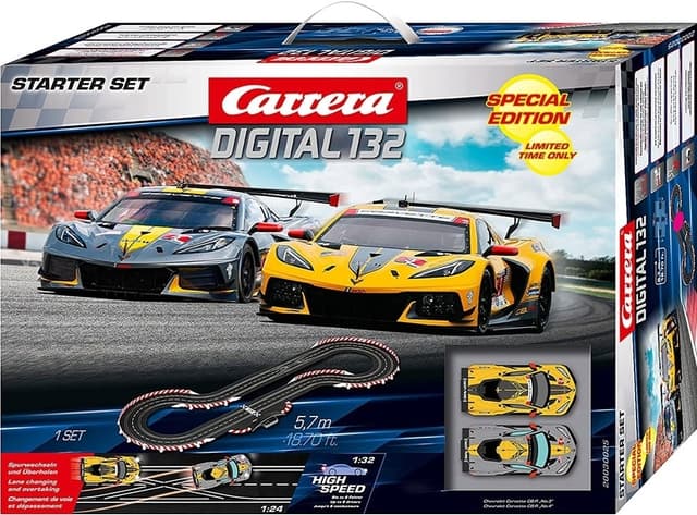 * 2x Chevrolet Corvette C8.R Gul og sølv-grå. * Bilbane på 5.7 m med vekslingsspor, curbs og autovern. * 2x håndkontrollere med hastighetsjustering og vekslingsknapp * Strømforsyning og tilkoblingstilbehør