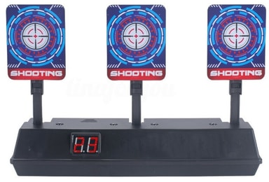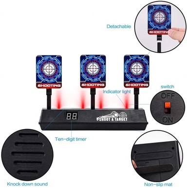 Elektrisk snikskytterbrett med poengberegning og lydeffekter. Konkurrer i snikskytterskyting med venner eller øv på egen hånd. Den elektriske skyteskiven har lyd- og lyseffekter for å oppmuntre skytteren til å score. Når alle målene er skutt ned, går de automatisk opp etter 3 sekunder.Funksjoner og egenskaper: