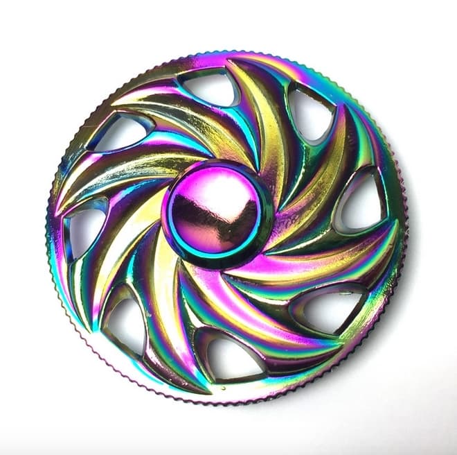 Trearmet spinner i metall. Spinneren leveres flott oppbevaringsboks i metall. Rastløs og klør i fingrene? Med en spinner har du alltid noe å fikle med. Spinneren er utstyrt med kulelager i senter og vekter i hver arm. Spinn, balanser og la deg fascinere. Metallspinneren er dekorert i oljefarger, og hver spinner har derfor sitt egne unike design. Fargene varierer i nyanser mellom lilla, blå, grønn, orange, gull m.m.