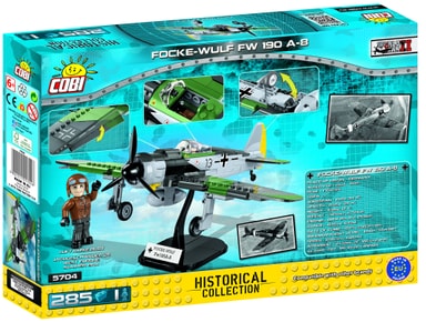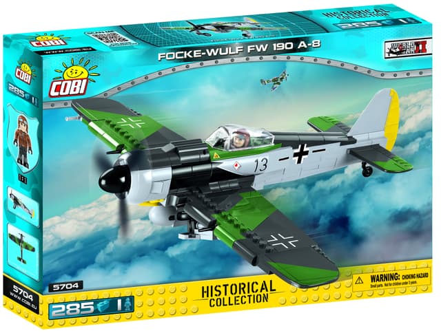 Fra COBI-verdenen kommer en modell av Focke-Wulf Fw190 A-8-flyet. Mange bevegelige elementer som roterende propeller, bevegelige vinger, gummihjul, som kan brettes til en horisontal posisjon som gir stor moro for selv de yngste entusiastene av militær og luftfart. De minste detaljene og spesifikke fargene på flyet er kartlagt. Cockpiten kan åpnes for å plante en pilotfigur i setet. Takket være et spesielt visningsstativ med en plakett med navnet på flyet, vil modellen se bra ut som et ornament i enhver samling. Modellen bruker holdbare utskrifter og klistremerker med historiske markeringer.