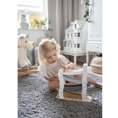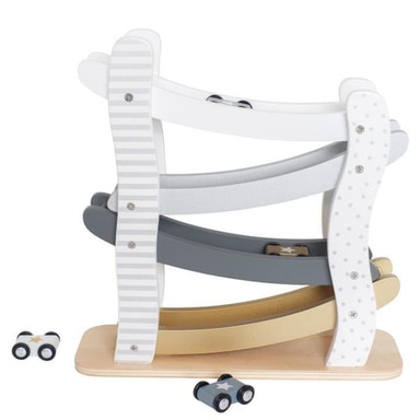En klassisk og morsom bilbane i sølv og gull. Slipp bilene på toppen av banen og se dem suse hele veien ned. En stimulerende og underholdende bilbane som holder barnet aktivt i lang tid. Et must for alle små racerkjørere. Bilbanen har 4 matchende biler i forskjellige farger.Denne teksten er automatisk oversatt, og det kan forekomme feil.