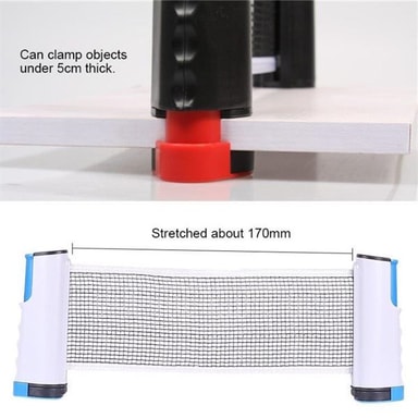 Med dette bærbare pingisnett trenger du ikke å ha tilgang til et pingisbord for å kunne spille pingis! Rull bare ut nettet, montere det enkelt på hvilket bord du vil (overflatetykkelse på maks 5 cm) og utfordre vennene på en bordtennismatch etter middagen. Dere trenger selvfølgelig racket og ball også!