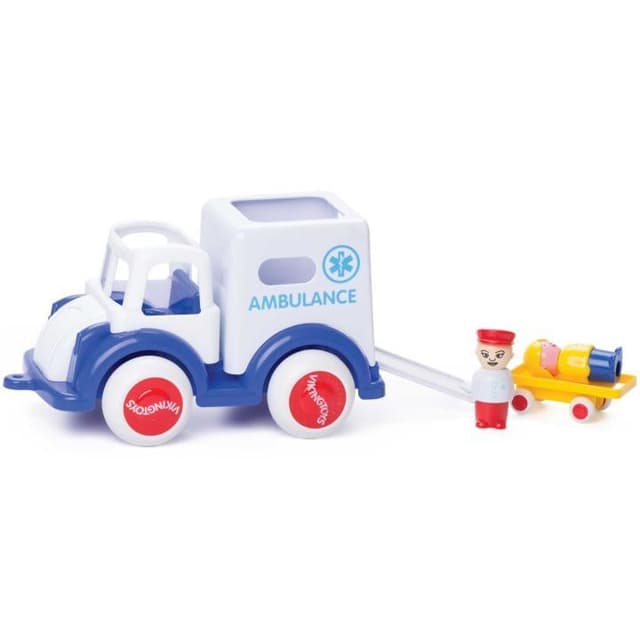 Ambulans med två figurer och en bår med tryck. Förpackad i presentförpackning