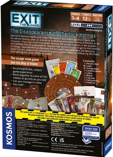 I EXIT: The Disappearance of Sherlock Holmes brettspill trenger Dr. Watson din hjelp med å finne Sherlock Holmes, som gikk i dekning etter å ha blitt beskyldt for mord. 1-4 spillere kan sammen løse mordgåten og renvaske Sherlocks navn.Les mer om produktet