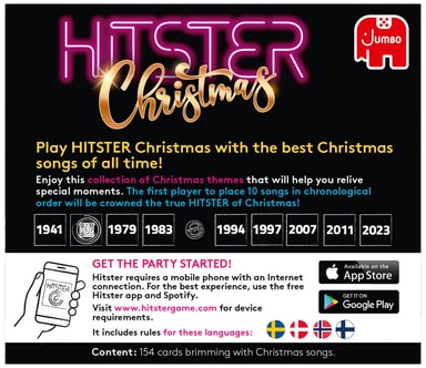 Jumbo Hitster Christmas Soundtracks kortspill er et musikkspill med 300 julesanger. Bruk den medfølgende appen til å scanne og spille av sanger, og gjett utgivelsesåret, artist, eller sett sanger i rekkefølge på en tidslinje.