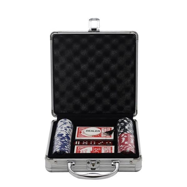 Den robuste aluminiumesken inneholder 2 kortstokker, 5 terninger, 100 brikker og 1 forhandlerknapp