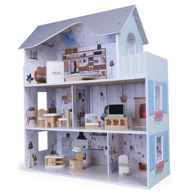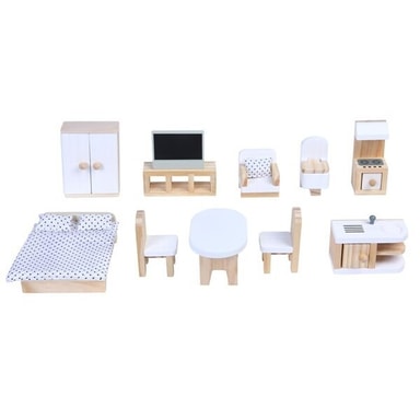 • Innhold i pakken: dukkehus i tre, bord, 2 x stoler, lenestol, TV, TV-bord, 2 x møbler til kjøkken, skap, seng og toalett