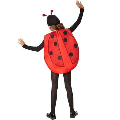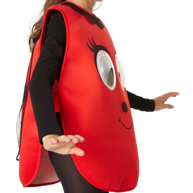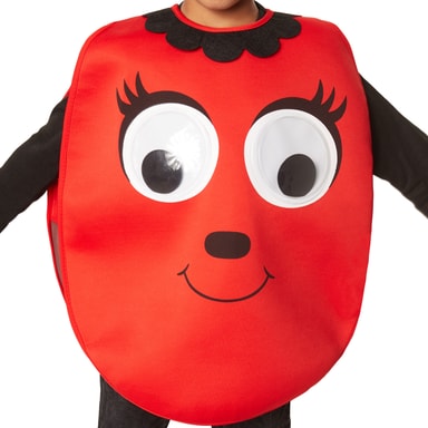 Kostymet Cartoon-bille til jenter og gutter består av en poncho med borrelås bak. På fronten er det påsydd store plastøyne og påsatt nese og munn. Krage med svart, rund kant. På baksiden med borrelås er det påtrykte svarte prikker på vingene av tyll. To følehorn og én solsikke påsydd på filthatten. Materiale: 100 % polyester.
