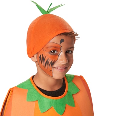 Kostymet Cartoon-gresskar til jenter og gutter består av en poncho i ulike oransjefarger. På fronten er det påsydd store plastøyne og påsatt nese og munn. Kragen har en grønn kant. Borrelås på baksiden. Filthatten har påsydde blader øverst. Materiale: 100 % polyester.