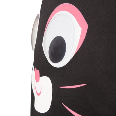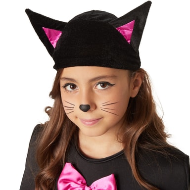 Kostymet Cartoon-katt til jenter og gutter består av en svart poncho med hvite og rosa effekter og borrelås bak. På fronten er det påsydd store plastøyne og en tversoversløyfe, samt en nese med værhår. På baksiden er det en påsydd kattehale av fløyel. Filthatt med spisse ører. Materiale: 100 % polyester.