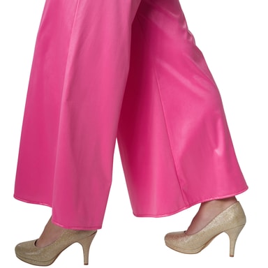 Damekostymen Disko stjerne pinky består av en overdel og en bukse. Den svarte blusen har påsydd krage i rosa, matt skimrende tekstil. Trompetarmene og tilhørende bukse er i samme tekstil og samme farge. Den gullfargede bukselinningen med gummistrikk sørger for at buksen sitter som den skal. Buksen skrår utover fra skrittet og ned, materiale: 100 % polyester.