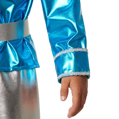 Diskogutten kaster glans på festen. Ingen kan unngå å legge merke til den sølvfargede buksen med slag og den blå overdelen med pynteborder. Beltet og det strålende halstørklet forsterker denne effekten. Og alle blir smittet av de fengende dansestegene. Skap 70-tallsstemning på dansegulvet med dette diskokostymet.