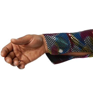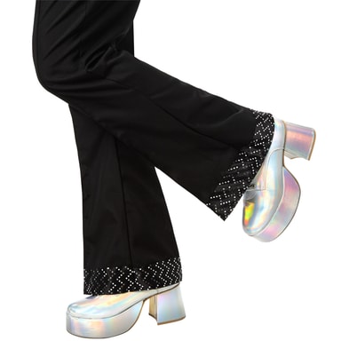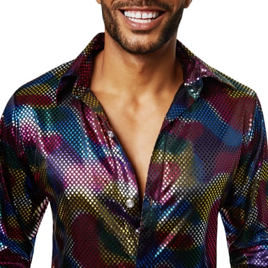 Mannsantrekket Diskokonge har en lang bukse med press og vid sleng, knapp, glidelås, elastisk linning og beltespenner. På den brede hælen er det et mønster av glinsende prikker. Den langermede skjorten med knapper har krage og et regnbuefarget mønster av glinsende prikker. Materiale: 100 % polyester.