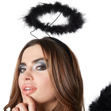 Damekostymet engel består av en armløs, kort kjole med spagettistropper. Snittet er figursydd, med et kort, sølvfarget overskjørt med prikker. To underskjørt er laget av sateng, mens det tredje av tulle med ruffles. Formcups på toppen er dekorert med en sløyfe. To dekorative bånd i sort og sølv går under brystet til skjørtet. Et elastisk gummistrikk sikrer bedre hold. På ryggen finner man en glidelås, materiale: 100% polyester.