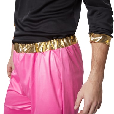 Denne todelte guttekostymen discodanser har flotte, gylne effekter på kragen, armene og i bukselinningen. Den svarte overdelen er figurnær. Både armer og bukselinning har strikk. Den rosafargede buksen er blank og beina skrår ut fra lårhøyde, materiale: 100 % polyester.