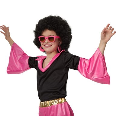 Jentekostymen Groovy Disco Girl består av overdel og bukse. Den svarte blusen har påsydd krage i rosa, matt skimrende tekstil. Trompetarmene og tilhørende bukse er i samme tekstil og samme farge. Den gullfargede bukselinningen med gummistrikk sørger for at buksen sitter som den skal. Buksen skrår utover fra skrittet og ned, materiale: 100 % polyester