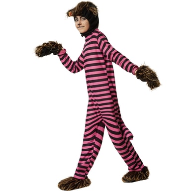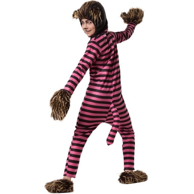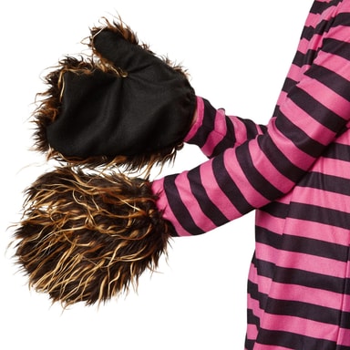 Unisexkostymet Hemmelighetsfull glisekatt består av en kjeledress med glidelås på ryggen, en hette med borrelås under haken, hansker samt sko. Kjeledressen har rosa og svarte striper på tvers og på den nedre delen av ryggen en kattehale med bøyelig metalltråd. Hetten med katteører, hanskene samt skoene er laget i svart plysj med kant av imitert pels, materiale: 100% polyester.