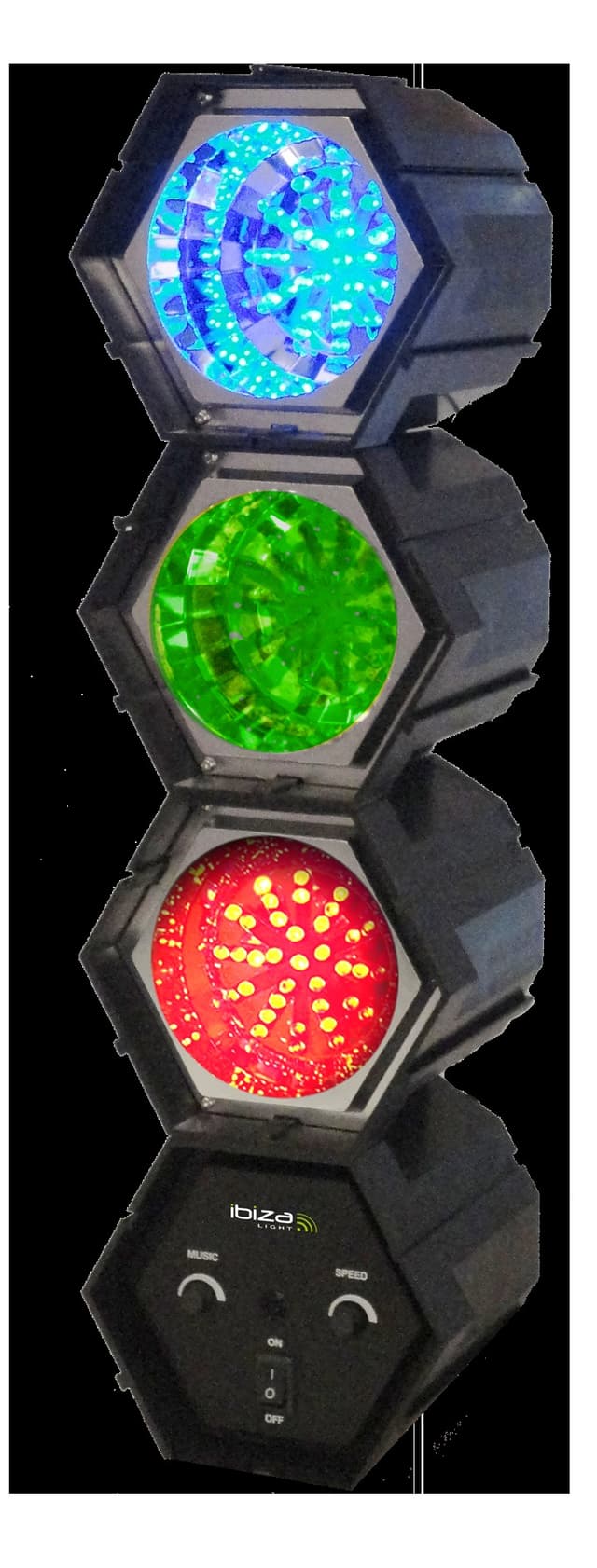 Cool party-ready modular and linkable led light system composed of 3 light modules plus a control unit. each module features 47 coloured and powerful leds. The modules are music controlled via a built-in microphone. The control unit also features manual speed control. mains adaptor included.