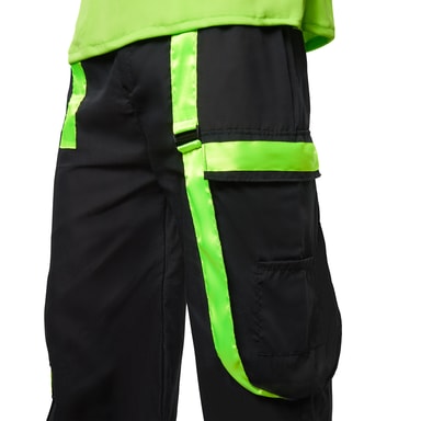 Herrekostymet kul raver består av en lang bukse samt en overdel. Den ermeløse skjorten er laget av neongrønt satengstoff. På brystet er det et trykt svart tribal tegn. Den svarte buksa med sleng har elastisk linning, knapp, glidelås og beltehemper. På hvert buksebein er det neongule striper på langs og tvers. På venstre buksebein er det en stor og en liten sidelomme, materiale: 100% polyester.