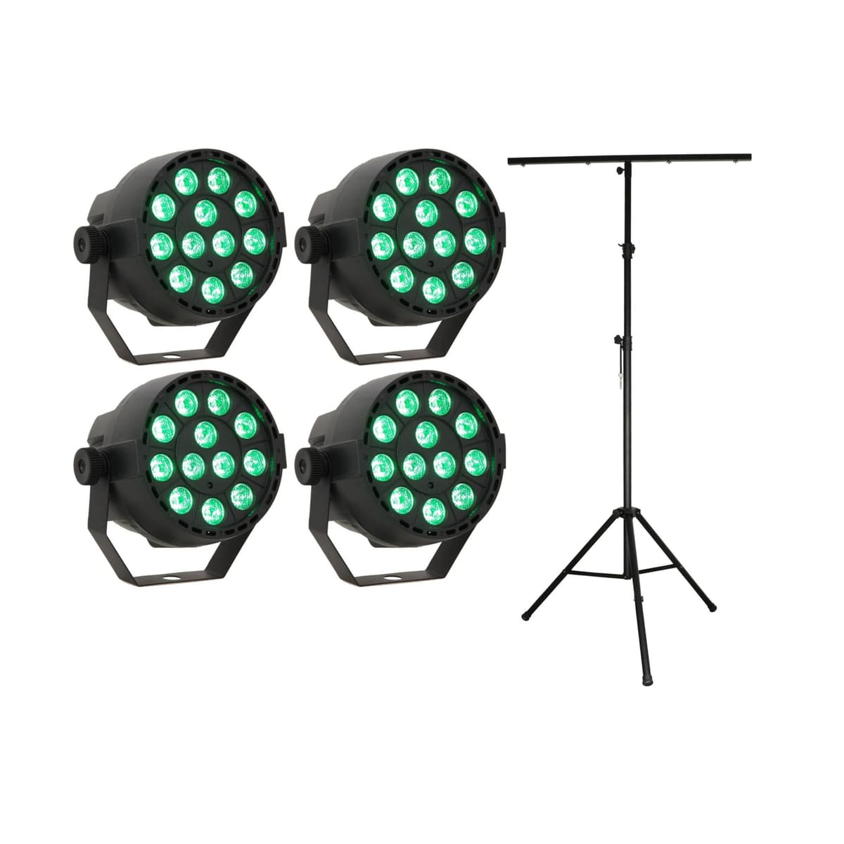 Her får du 4stk LED Spot Multicolor m. fjernkontroll(12x3W) samt et tilhørende stativ.