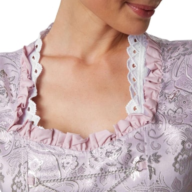 Den sofistikerte Maxi-Dirndl Neuschwanstein fås i feminine fargetoner. Et sølvfarget blomstermønster pryder overdelen i en myk rosafarge. Den slående utringningen er pyntet med rysjer. Et lite kjede med fine ledd gir snøringen styrke. Rundt den hvite skjørtedelen er det bundet et forkle i matchende farger, som på en perfekt måte avrunder den elegante looken, Materiale: 100 % bomull.