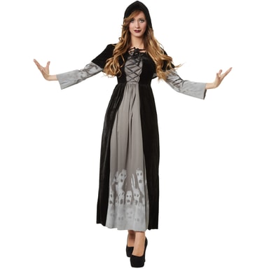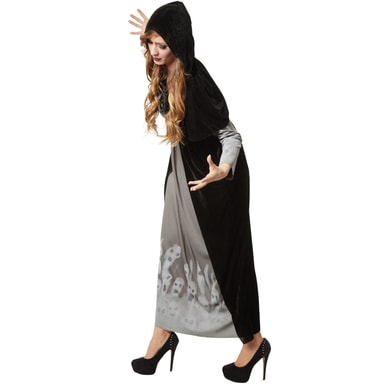 Damekostymen mektig magiker består av en ankellang kjole i svart fløyel med et grått innlegg på ermene og fra brystet og ned til skjørtekanten. Ermene og nedre del av skjørtet har trykk med hvite spøkelsesansikter.Les mer om produktet