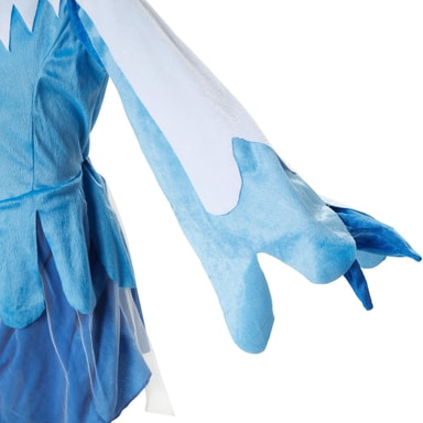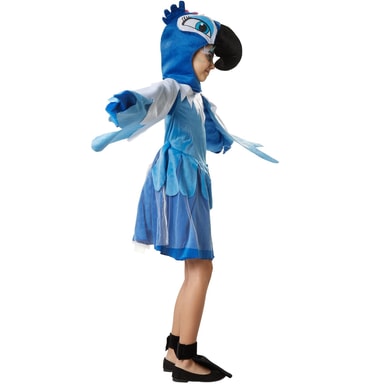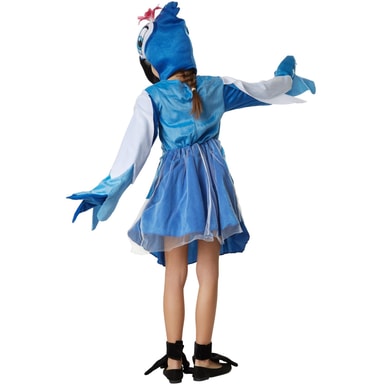 Jentekostymet Praktfull papegøye er av plysj og består av en kort kjole, en lue samt lange strømper formet som klør. Den korte kjolen med borrelås i nakken er formet med flere ulike blånyanser. Kragen har en hvit påsats med sikksakkmønster. Ermene er lange og lukket foran i et sikksakkmønster, med en åpning på høyde med håndleddet. Over ermene former to lag stoff fjærene, det øverste laget er i likhet med krageinnsatsen i hvit farge. Skjørtet er av plysj og det øverste laget er av hvit tyll. Ovenpå dette laget er det festet stoffstrimler som forestiller fjær. Luen har en kam, et stort, svart nebb og en rosa blomst. De store øynene er foret. Hetten festes ved halsen ved hjelp av en borrelås. På strømpene er det også en borrelås, materiale: 100% polyester.