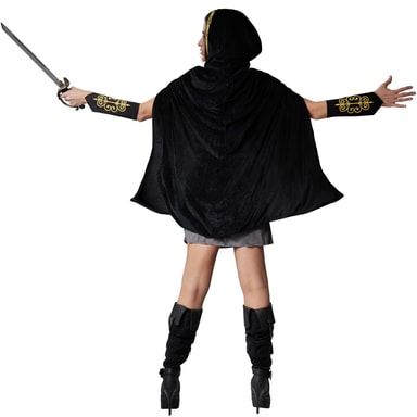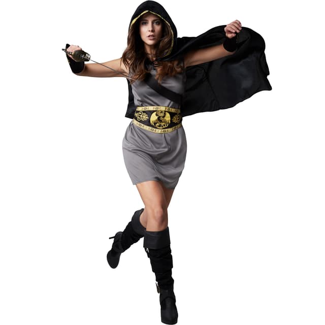 Damekostymen Rask jeger består av en knelang, grå ermeløs kjole. Et svart belte går fra høyre skulder, tvers over brystkorgen og ned til venstre hofte. Det er en snøring i halsåpningen. Kostymet kompletteres av et magebelte i svart med gylne ornamenter og to pynteborder med gylne blomster. Svarte armmansjetter med gylne ornamenter og en kappe med hette i svart fløyel følger med i leveransen. Hetten kan snøres sammen og har en pyntebord langs sømmen. Denne er i samme mønster som magebelte, materiale: 100 % polyester.
