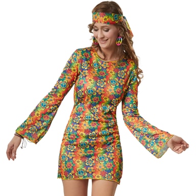 Damekostymen rebelsk Hippie Squaw består av en kort, fargerik kjole med blomstermønster, peace-tegn og smileys. De lange ermene har trompetform. Over kjolen sitter en ermeløs vest med lange frynser i imitert semsket skinn. Pannebåndet knytes og har samme mønster som kjolen, materiale: 100 % polyester