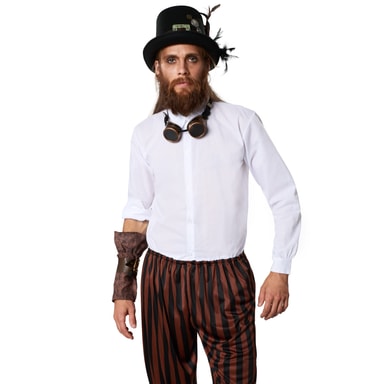Herrekostymet «Steampunk-eventyrer» består av en lang, stripete satengbukse og støvelmansjetter med en look i semsket skinn. Overdelen består av en langermet skjorte med knapper og krage. Den ermeløse vesten med en look i semsket skinn har også knapper og antydede fløyelslommer, et gullkjede og en lakkrage. Et belte og en ermelinning hører også til antrekket, materiale: 100 % polyester.