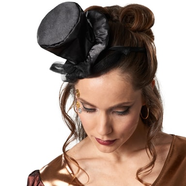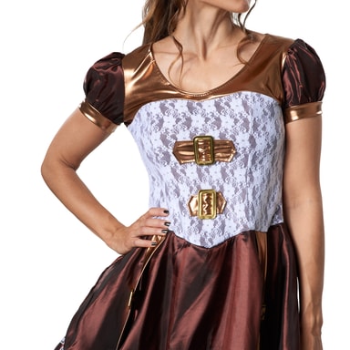Damekostymet «Steampunk Lady» består av en kortermet satengkjole og et langt skjørt, prydet med rysjer og belter med spenner. Begge underskjørtene er av sateng og tyll. Overdelen er i blonder i form av blomstermotiver. Under den finner man sateng. Foran er det sydd på to beltespenner. Utringningen er i et glinsende stoff, og det samme er mansjettene på ermet. Det finnes en glidelås på ryggen. Den lille hatten med sløyfe av tyll fungerer som et nydelig tilbehør, materiale: 100 % polyester.