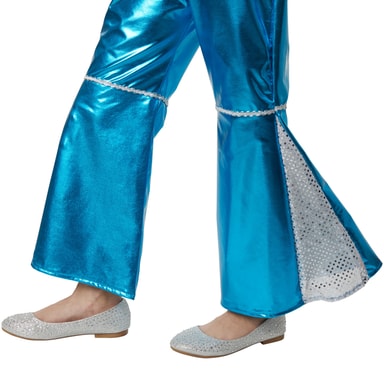 Jentekostymen strålende Disco Starlet består av en del i neonblå, blank tekstil. Et stort glidelås midt framme gjør at den er lett å ta på. Dyp v-hals og aktuell krage i 70-tallsstil. Armer og buksebein med mye vidde. Buksebeinene har en pyntebord i knehøyde. Kragen og innsatsene på armer og bein er i gjennomsiktig, lysegrå tekstil med sølvfarget tråd. Her sitter paljettlignende, sølvfargede, blanke punkter. Sølvfarget belte med beltespenne farget i rustfritt stål følger med i leveransen, materiale: 95% polyester, 5% elastan.