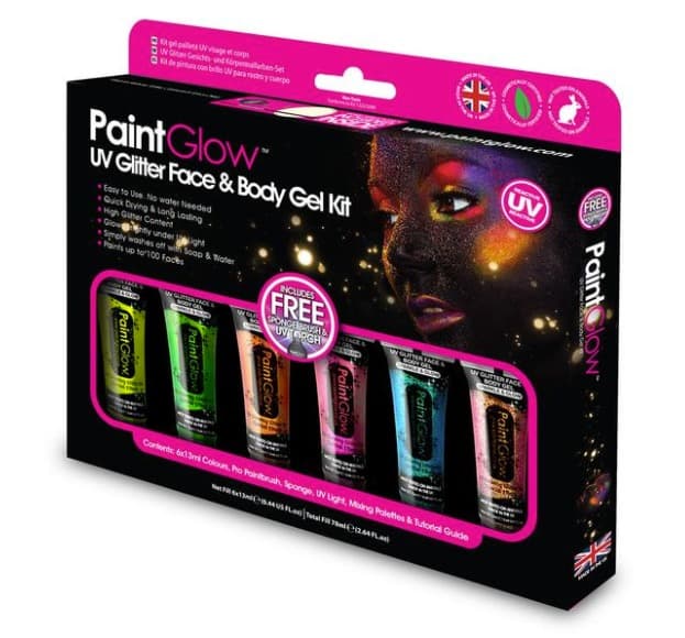 Uv glitter face- and bodypaint set. uv active glitter paint. contains 6 x 13 ml. Uv paint, uv keychain, brush and sponge. illuminated under uv light. can be used on both face and body. 6 different colors in the package. enough for 5-6 people. wash with soap and water. the package contains 6 x 13 ml. Uv active glitter paint for face and body, uv keychain, brush and sponge. make amazing glitter effects on face and body using our uv glitter face & body paint! Clear neon shimmer colors under natural lighting. Fantastic fluorescent under uv lighting / blacklights. the fast drying, flake free formula ensures your motifs will last all night! Perfect for discotheques, parties, festivals, uv sports, stage performances and other places with uv lighting. how to use the paint: apply on the skin using fingers, a brush or sponge. avoid contact with eyes. add more layers (when dry) to increase glitter and uv effect / coverage. after use, the glitter paint can be washed off the skin with soap and water.