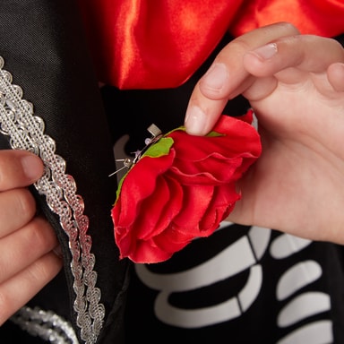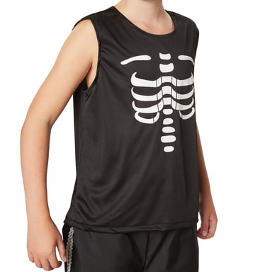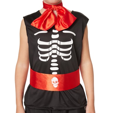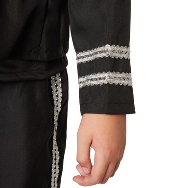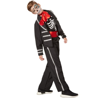 Guttekostymet nifs gentleman består av bukse med elastisk linning, jakke og ermeløs skjorte med påtrykt skjelett. Buksebeinene har doble, sølvfargede blondeborder, og det samme har kragen, ermene og forstykket. Kostymet kompletteres av et magebelte i sateng med dødningehode, en stor sløyfe og en rosebrosje. Slipset og magebeltet festes med borrelås, og brosjen festes med en nål, materiale: 100 % polyester.