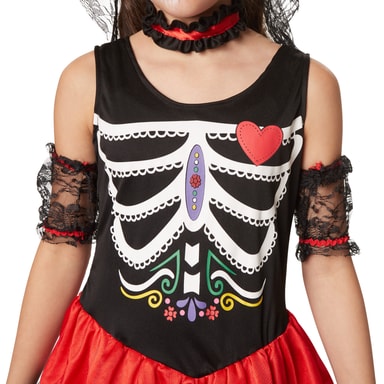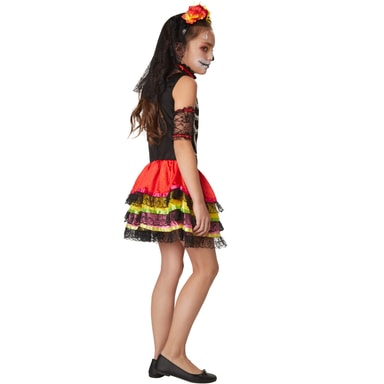 Jentekostymen nifs meksikaner består av en ermeløs kort, kjole. Overdelen er mønstret med fargerik pynt, et stort skjelettmønster og hjerte på venstre bryst. Skjørtet består av tre lag med kant i blank sateng og blondekanter. Halsbåndet som føler med lukkes med borrelås. Det er laget av foldet tekstil og er dekorert med et rødt bånd i sateng. Mansjettene på armene er i svart blonde med røde strikk. Et diadem med blomster i flere farger og svart blondeslør kompletterer denne nifse minikjolen, materiale: 100 % polyester.