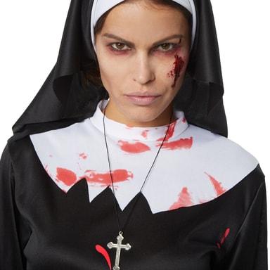 Den nifse nonnen ser ut til å ha kommet bort fra dydens smale vei. Nonnekjortelen er full av blodflekker. Hva har skjedd bak de tykke klostermurene, mon tro? Det ser iallfall ikke ut til å ha noe med nestekjærlighet å gjøre. Ta på deg denne nonnekjortelen med syndig kort skjørt, og omgi deg med den mystiske auraen til den skumle nonnen.
