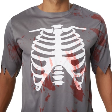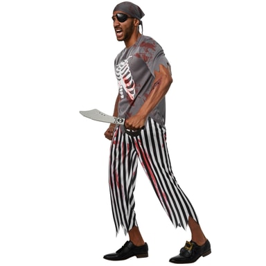Mannsantrekket Nifs pirat har en lang, stripete bukse. Den kortermede skjorten har skjelettmotiv i form av brystkasse og ryggrad. Buksen og skjorten har takket mønster i endene, og er dekket av blod.Les mer om produktet