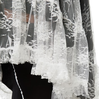 Kvinneantrekket Nifs skjelettbrud har en Vokuhila-kjole med dobbelt stoff og blondebelagt stiv snipp samt innsydde, vatterte brystskåler. Innsvinget snitt. Skjørtesøm og ermer påsydd i trompetutførelse Hele utringningen har delikate blonder med blomsterornamenter. Det samme gjelder overskjørtet over det svarte satengstoffet. På ryggen er det en lang glidelås som begynner ved krageoppsatsen. Det svarte midjeområdet har et påtrykt skjelettmotiv og et lite hjertemotiv. Ermeoppbrett og knesokker med skjelettmotiv følger også med. Et slør ved hårspennen, spent fast med røde og hvite blomster, hører med. Materiale: 100 % polyester.