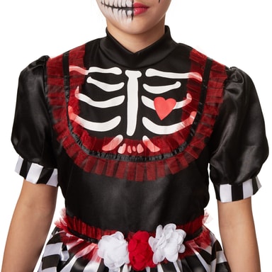 Jentekostymen nifs skjelettdame har korte armer med skjelettrykk på utringningen, krage og svart- og hvitstripet bånd på ermene. På skjelettmønsteret sitter en rød tyllkant. Røde og hvite påsydde blomster danner et belte.Les mer om produktet