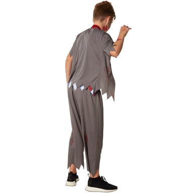 Kostymet nifs skolegutt har frynsede deler med blodflekker. Den lange buksen er hullete og har strikk i midjen. Den ermeløse overdelen har kortarmet vest. Slipset med langsgående striper kompletterer kostymet. materiale: 100 % polyester.