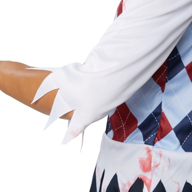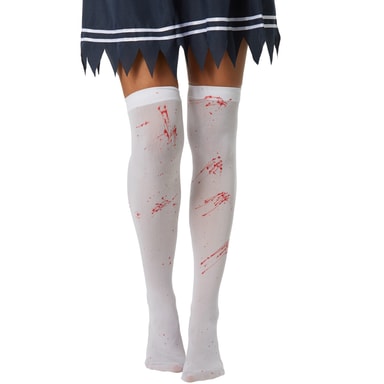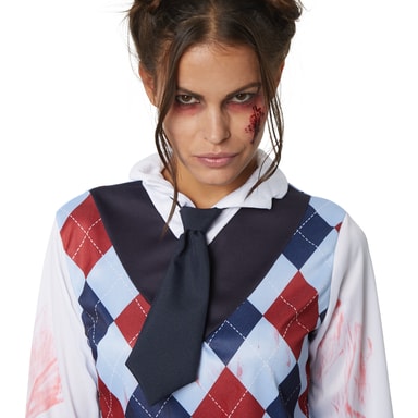 Kvinneantrekket Nifs skolepike har en overdel i slipover-optikk med rutemønster. De påsydde skjortedelene er frynset i endene og dekket av blod. Det tilhørende skjørtet med strikk har to påsydde striper på sømmen, og er også frynset. Slips med strikk og blodige knestrømper gir et spesielt utseende. Materiale: 100 % polyester.