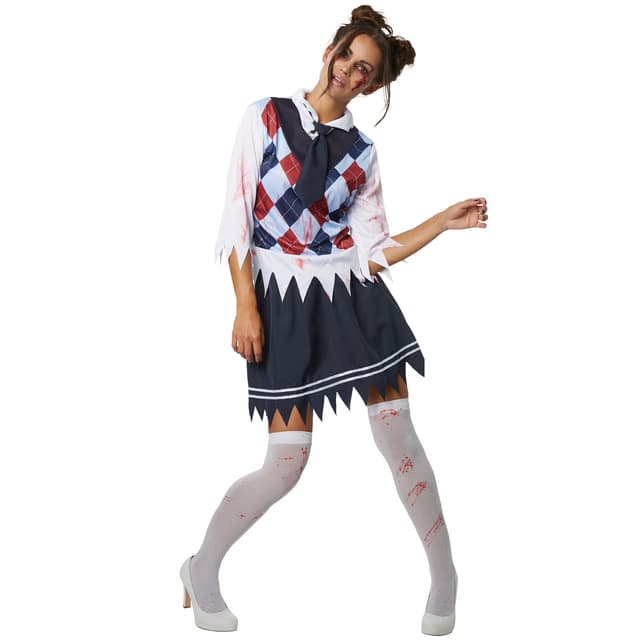 Kvinneantrekket Nifs skolepike har en overdel i slipover-optikk med rutemønster. De påsydde skjortedelene er frynset i endene og dekket av blod. Det tilhørende skjørtet med strikk har to påsydde striper på sømmen, og er også frynset. Slips med strikk og blodige knestrømper gir et spesielt utseende. Materiale: 100 % polyester.