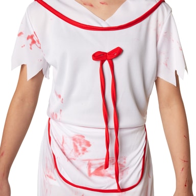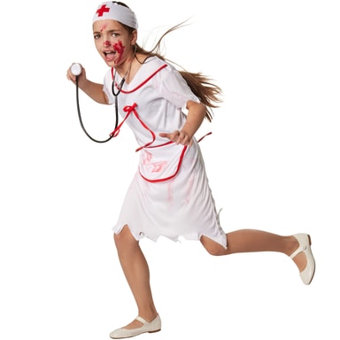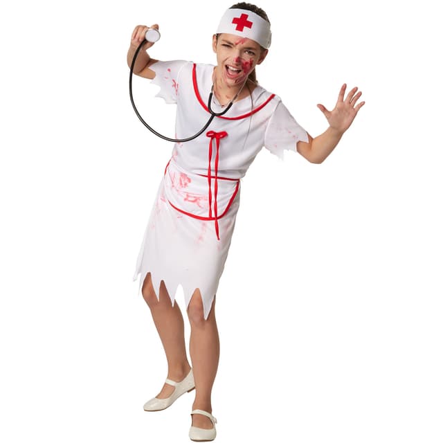 Jentekostymet nifs sykepleier består av en kort kjole i hvitt og rødt. Kostymet har frynsete, korte ermer, og sømmene på skjørtet er også frynsete. På kragen har kjolen en rød bord. På øvre del av brystet sitter en rød sløyfe. Både kjolen og forkleet, som kan knytes på, har blodflekker. Pannebåndet som følger med festes med borrelås og har et påtrykt rødt kors, materiale: 100 % polyester.