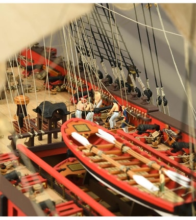 Modelbyggesett av den imponerende treskipsmodellen i skala 1:84. Dette settet leveres med 5 metalfigurer (umalte), detaljerte messingdeler, pene tegninger og postere. I tillegg følger det med en pen stand til båten. Ekspertmodellere vil ha stor glede av dette kunstverket.