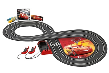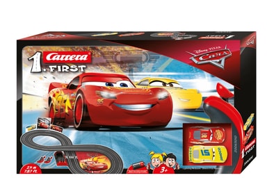 Analog bilbane i 1:43 skala for den minste med bilene fra filmen Biler 3, med legenden Lynet McQueen og Cruz Ramirez. Banelengde på 2.4 m med bro og bilde av Lynet McQueen som plasseres i senter av den ene svingen. First banene fra Carrera er ekstra barnevennlige og trygge da de benytter 4x C-batterier(kjøpes separat) istedenfor veggkontakt.