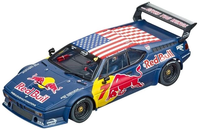 Analog bilbanebil i 1:32 skala kan brukes på allle tradisjonelle analoge bilbaner. Detaljert og lisensiert eksemplar av BMW M1 i Red Bull-farger brukt i HSR Classic 24-timers løpet på Daytona.Kan oppgraderes til bruk på digital bane med digital decoder.