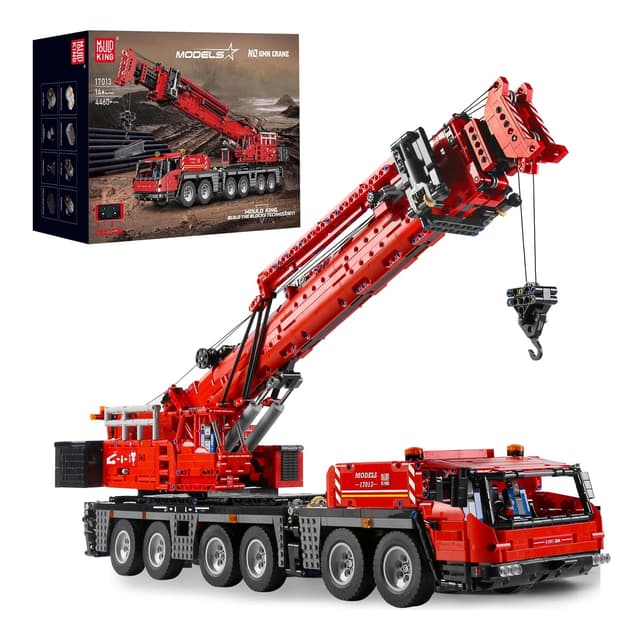 Med dette settet bygger du din egen kranbil som er 67cm lang og strekker seg nesten 1m høyt når kranen er helt utstrekt! Settet består av 4460 byggeklosser fra Mould King. Modellen er også radiostyrt og gir deg mange tøffe manuelle funksjoner som du finner på fullskala varianter av denne. På denne modellen har du muligheten til å styre svingen på hjulene, løfte kranen opp og ned, åpne og lokke bom og heise vaieren opp og ned, folde ut støtter og ikkeminst snu kranen 180 grader begge veier!